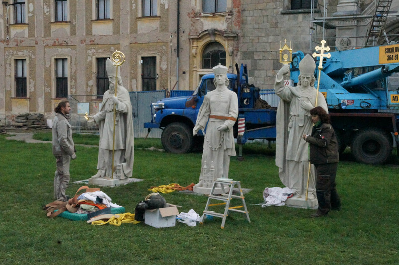 Die Holzfiguren werden abgenommen, damit die Schäden weiter untersucht werden können. Danach ist geplant, die Steinarchitektur zu reinigen und zu polieren, um die alte Farbigkeit und Strahlkraft wieder herzustellen.